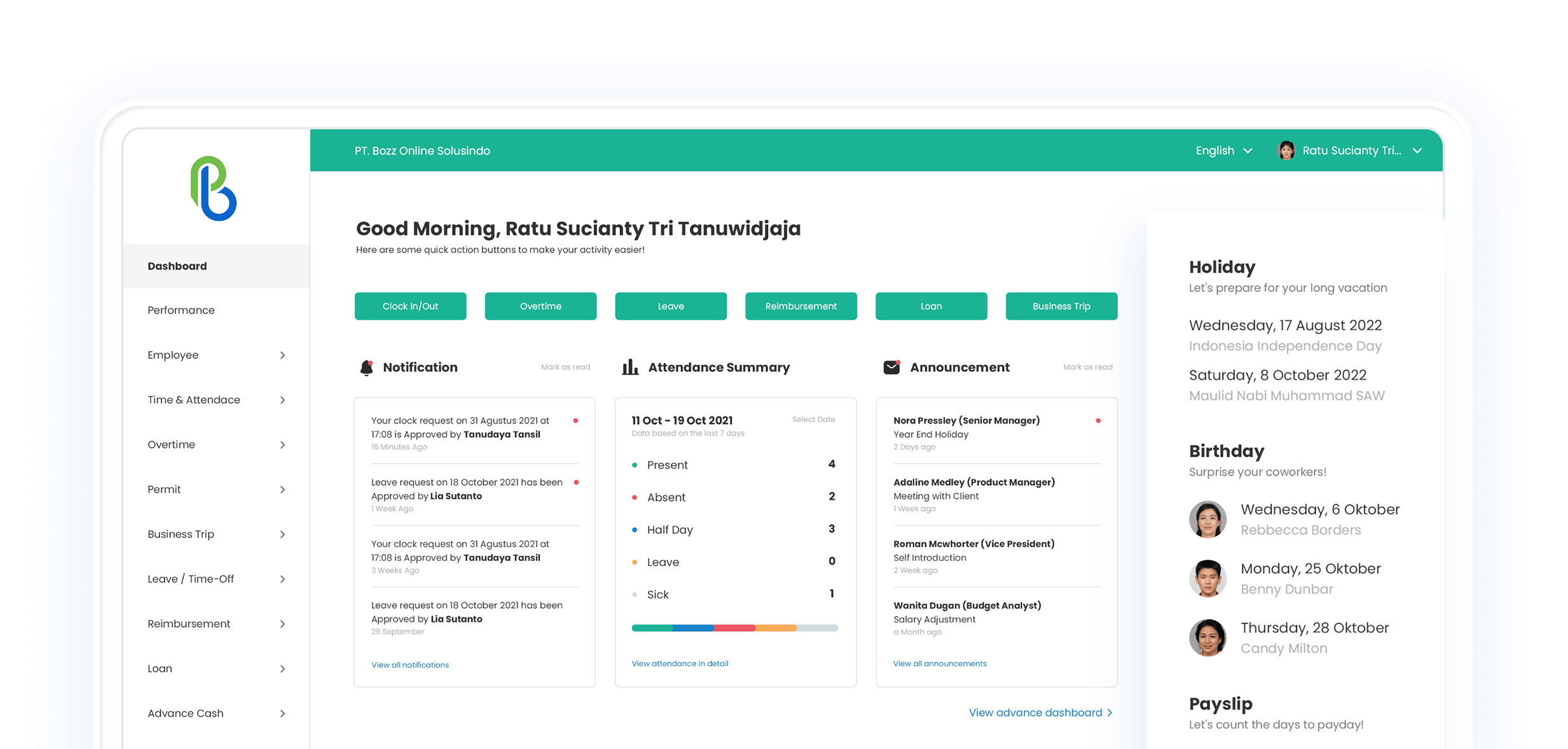 Optimalkan Absensi Karyawan, Penggajian, Pinjaman, hingga Reimbursement di dalam Satu Platform Cloud PayrollBozz. Temukan Solusi Terbaik, Aman dan Terjangkau untuk Bisnis Anda Sekarang!