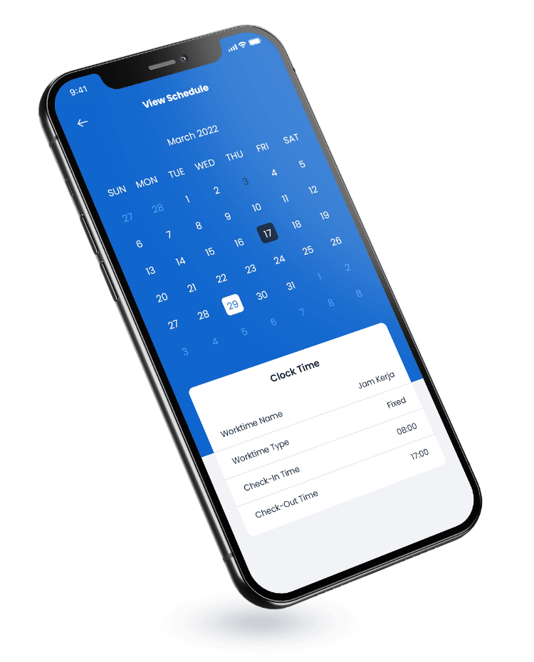 Menu view schedule pada aplikasi mobile PayrollBozz dapat menampilkan kalender kerja karyawan, lengkap dengan jadwal kerja perusahaan yang dimiliki oleh karyawan.