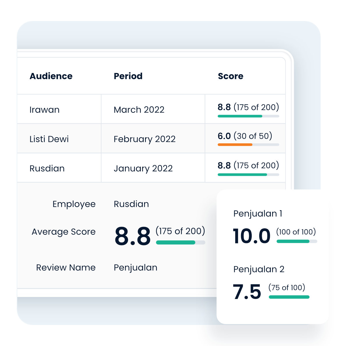 Untuk mengetahui performa masing-masing karyawan, HRD atau admin akan membuat pertanyaan dengan opsi jawaban sistem rating, Misal 0 sampai 10, atau 10 sampai 100. Ulasan atau penilaian dari manajer terhadap bawahannya ini, akan diakumulasikan dan dihitung dengan rumus. Hasil dari penilaian ini dapat dijadikan tolak ukur performa masing-masing karyawan, dan juga hasilnya dapat dijadikan data untuk pengambilan keputusan.